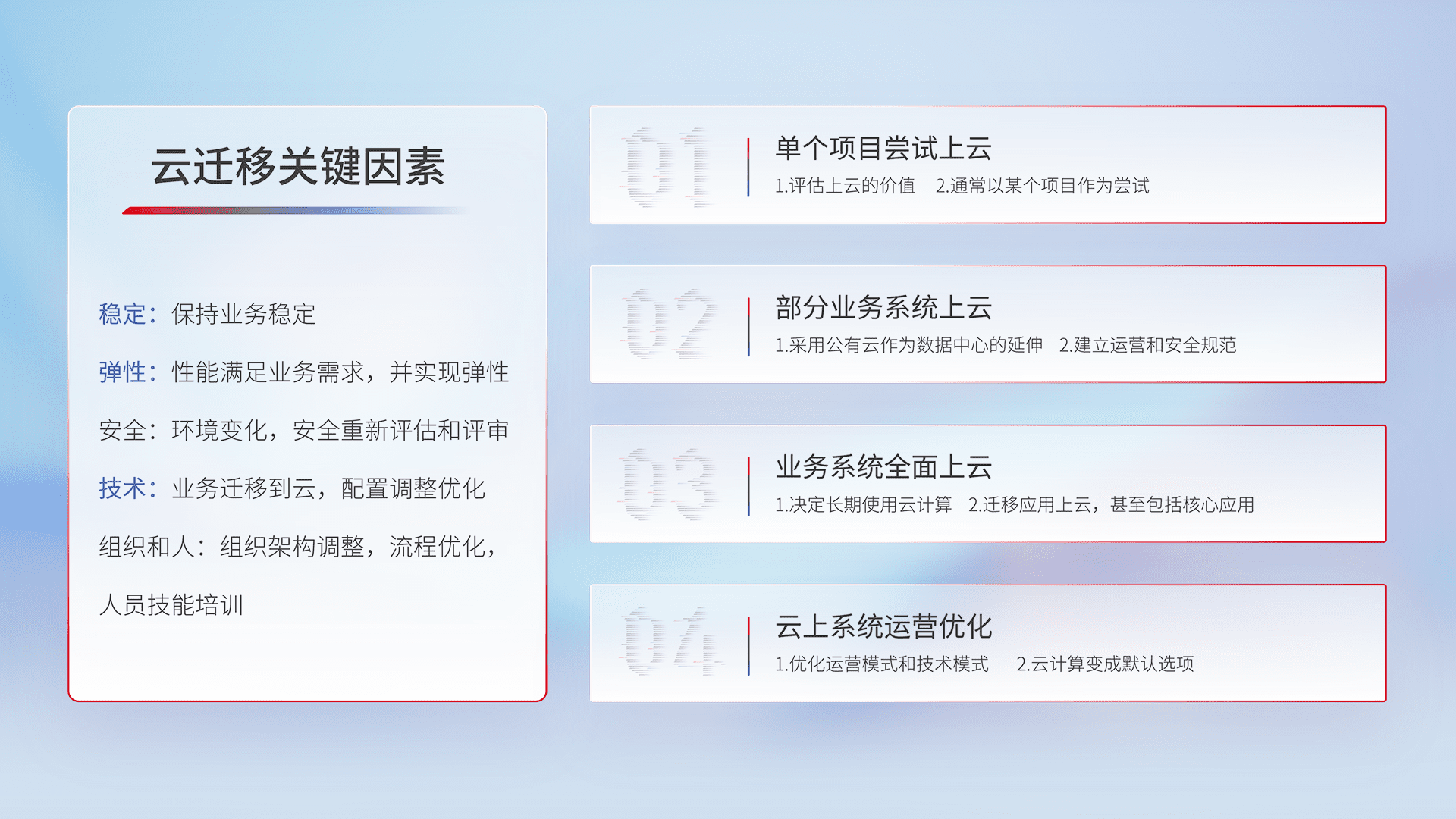 结合实际业务,,从规划设计、、云平台选型、、、云原生改造、、数据迁移、、集成交付,,,迁移全过程为客户识别最佳上云路径,,,做好风险识别管理,,,,设计网络架构、、身份权限、、安全审计合规、、、操作审计、、日志审计、、、监控告警策略、、、、多站点容灾设计等,,,对云上基础设施进行整体规划,,,提升IT治理水平,,,,以满足弹性、、高可用、、、、高性能的需求。。。。