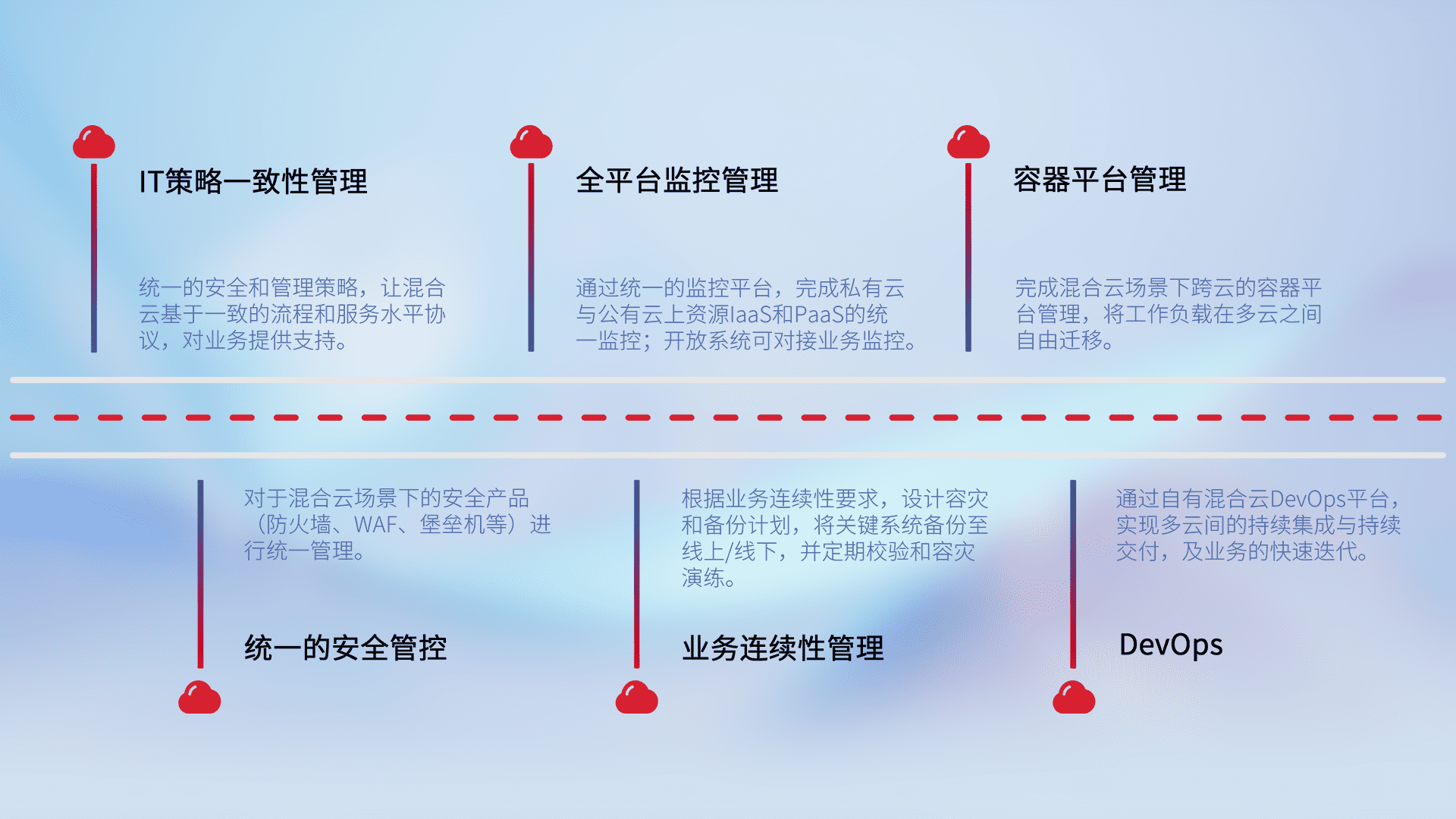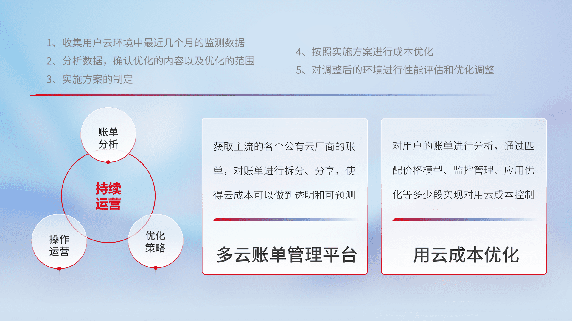通过多云纳管,,以统一的资源数据模型把客户的云资源进行抽象和封装,,,进而实现对多云资源的统一操作,,,保障云资源管理的可靠性、、、稳定性与可用性。。。量身定制化运维内容,,,,配置、、、、开发运维、、补丁管理、、备份、、、监控、、、认证和访问管理、、审计和日常巡检等,,,,保障在用云过程中的可靠度,,稳定度以及高可用率。。。