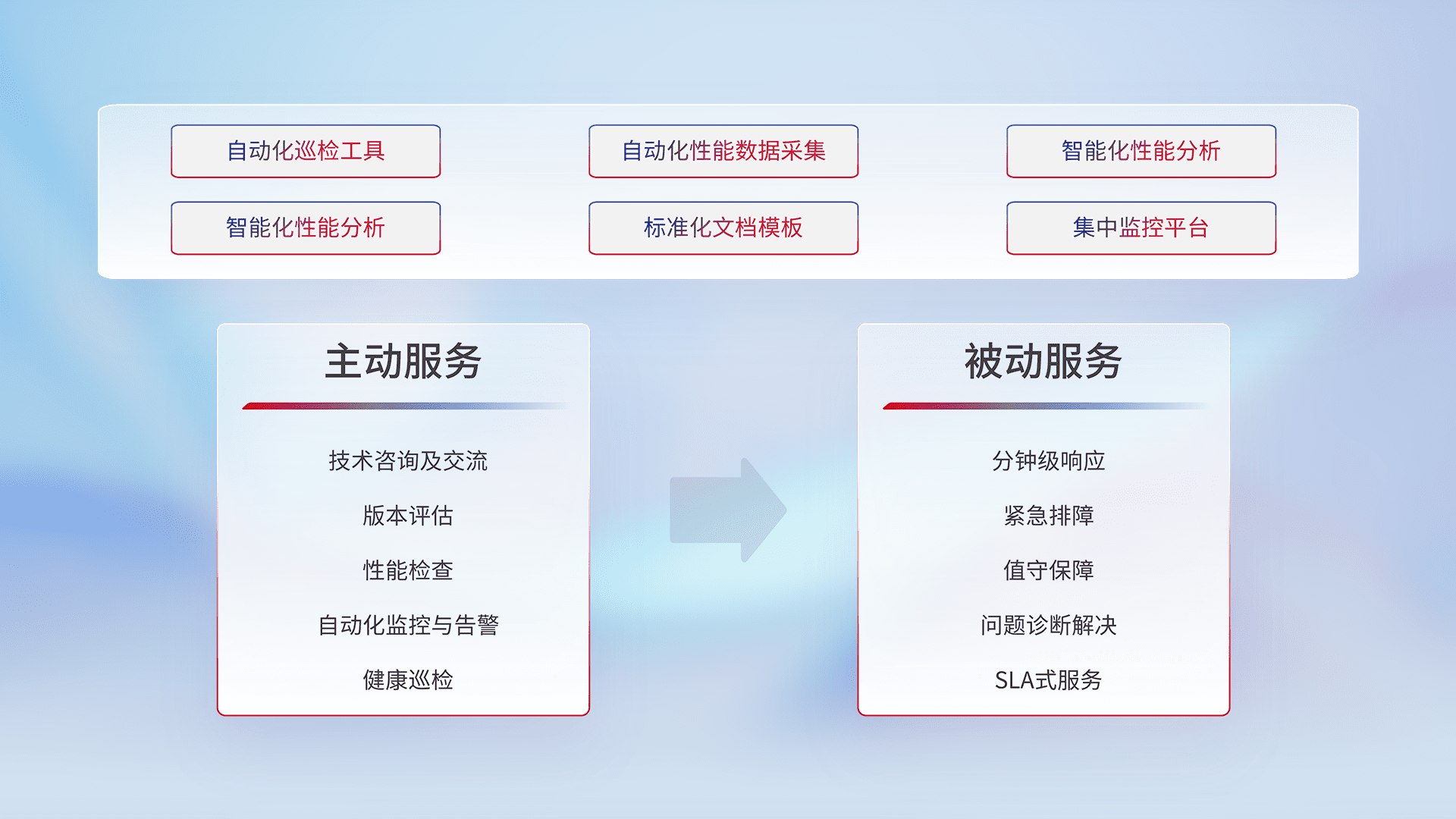 智能化工具和标准化文档,,,,保障服务质量,,提供主动服务(包含技术咨询、、版本评估、、、性能检查、、、、自动化监控与告警、、、健康巡检)和被动服务包含(分钟级响应、、紧急排障、、、值守保障、、问题诊断解决、、、SLA服务)。。